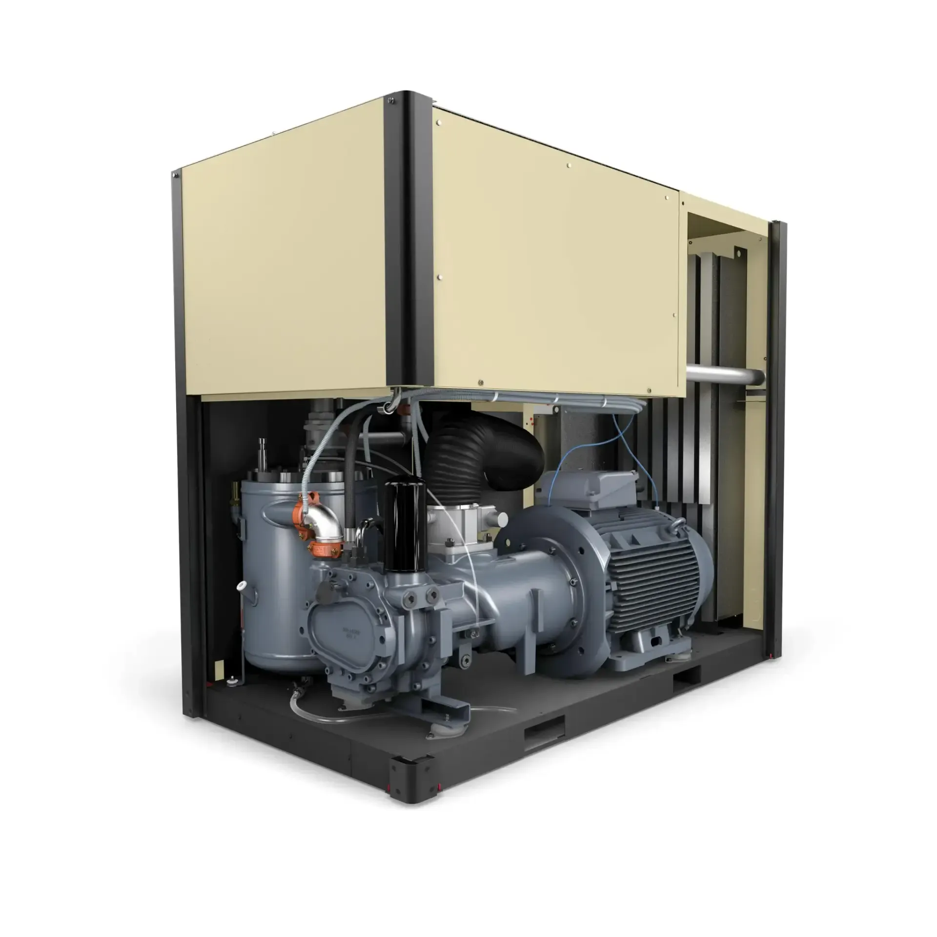 Design: Oil flooded, single stage rotary screw compressor,semi Integrated air end design, efficiency IE4 electric motors, star- delta starter